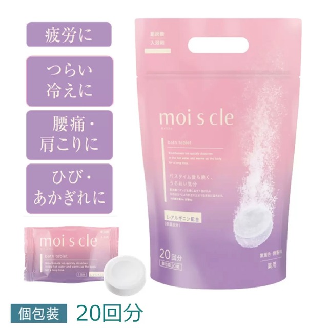 (商品の特徴) •保湿成分配合の重炭酸入浴剤 •血行促進で芯まで温まる •重炭酸イオンが水に溶け長く効果を持続 •無香料・無着色で肌が弱い方にもおすすめ •個包装で大容量20回分 【moi s cle(モイスクル)】 重炭酸イオンが水中に溶け込み、長くとどまるので、重炭酸入浴と温浴効果を長くお楽しみいただけます。 有効成分(炭酸水素Na、炭酸Na)による温浴効果で疲労回復、血行促進をサポートします。 保湿成分であるL-アルギニンを配合しています。 無着色・無香料です。 ◆効能 疲労回復、腰痛、肩のこり、冷え症、打ち身、くじき、あせも、神経痛、リウマチ、しもやけ、荒れ性、ひび、あかぎれ、しっしん、にきび、産前産後の冷え症、痔 ◆使用方法 180~200Lのお湯に1錠を溶かしてご使用ください。 40℃前後のお湯にじっくりと15分以上の入浴をおすすめします。 [医薬部外品]販売名:ノボピンタブK2