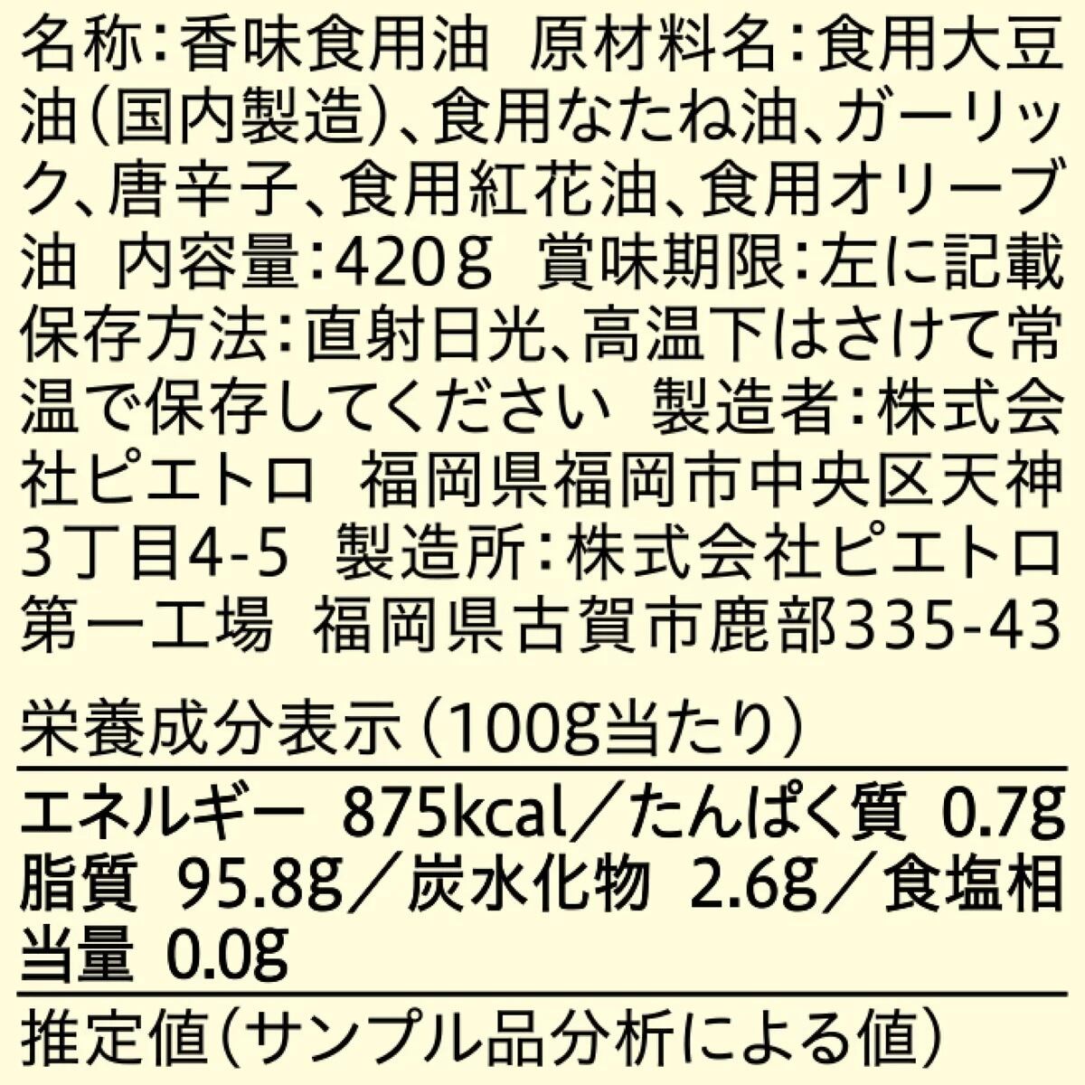 ピエトロレストランでシェフが愛用。にんにくをじっくりと低温で揚げることでオイルに豊かな香味を溶け込ませます。パスタ・チャーハン・ステーキ・野菜炒め・アヒージョ・ガーリックトースト他、にんにくを加えたい料理にご使用下さい。