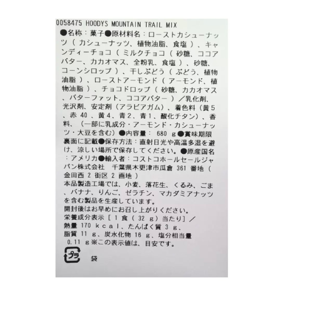 •カシューナッツ、ミルクチョコレートキャンディー、レーズン、アーモンド、ダークチョコレートチップス