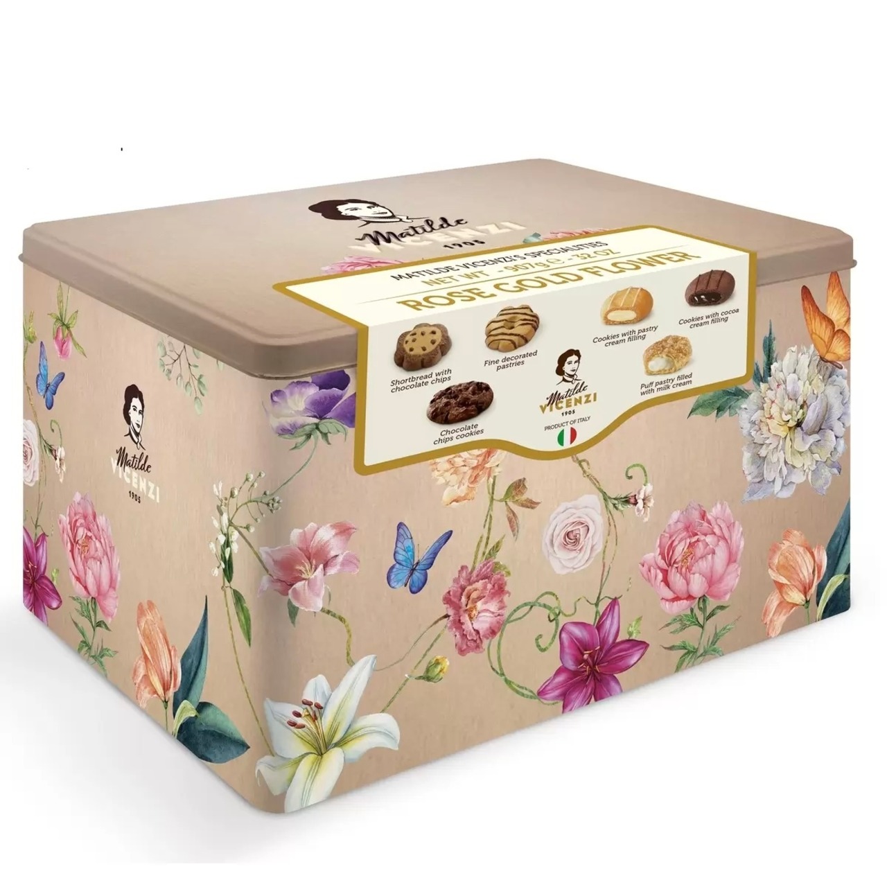 •イタリアの老舗菓子ブランドヴィセンチのローズゴールドフラワー缶クッキー詰め合わせ
